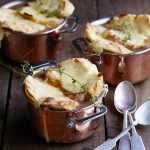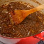 Pica las cebollas en pluma, que quede bien finita. Calienta en una olla la mantequilla y el aceite de oliva, agrega la cebolla, pimienta y sal. Cocina a fuego bajo y remueve con una cuchara de palo 20-25min, lo importante es que no se dore la cebolla. Si se empieza a dorar o a pegar a la olla, agrega cucharadas de caldo o agua tibia. Espolvorea 1 puñado de harina y remueve bien hasta que se dore. Agrega 20 ml de brandy o coñac y deja evaporar el alcohol, si no tienes de estos licores no hay problema, agrega un poco de vino blanco.