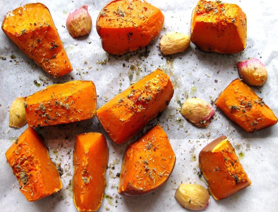 Troza el zapallo, mientras más pequeño quede, más rápida será la cocción, deben quedar de tamaño similar, así se cocinan todos por igual. Pon en una budinera junto a 1 cebolla chica trozada, 1 hoja de laurel, aceite de oliva, sal de mar, pimienta, ajo y la mantequilla