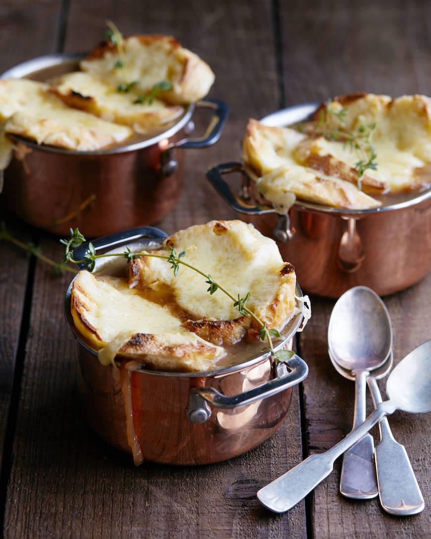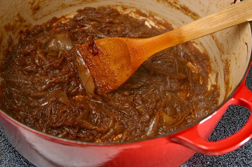 Pica las cebollas en pluma, que quede bien finita. Calienta en una olla la mantequilla y el aceite de oliva, agrega la cebolla, pimienta y sal. Cocina a fuego bajo y remueve con una cuchara de palo 20-25min, lo importante es que no se dore la cebolla. Si se empieza a dorar o a pegar a la olla, agrega cucharadas de caldo o agua tibia. Espolvorea 1 puñado de harina y remueve bien hasta que se dore. Agrega 20 ml de brandy o coñac y deja evaporar el alcohol, si no tienes de estos licores no hay problema, agrega un poco de vino blanco.