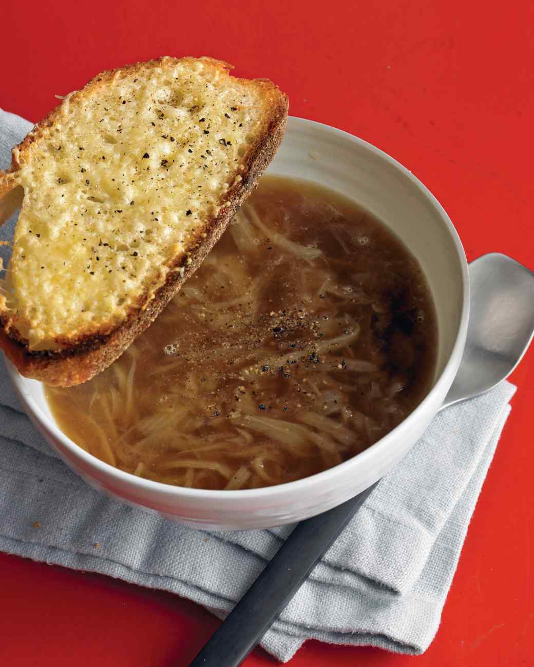 Sirve la sopa y agrega rebanadas de pan, espolvorea queso parmesano, hornea 5-6 minutos y ¡listo! No es necesario licuar ni procesar. La cebolla estará suave, sabrosa, increíble.