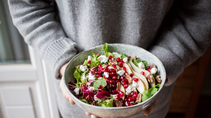 En un bowl ponemos la lechuga, y arriba ponemos los trocitos de pera, el queso y las nueces. Muy simple ¿no? Y para el aliño, mezclamos vinagre, aceite, miel y sal a gusto.