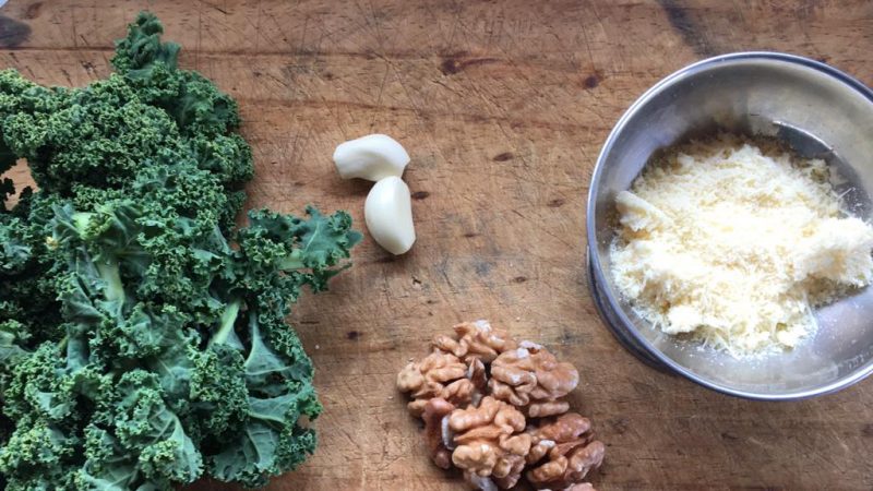 Necesitamos unas 4 a 5 hojas de kale, dos ajos, queso rallado, 6 nueces, sal y por supuesto aceite de oliva.