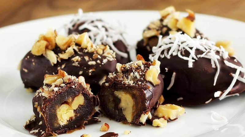 Tras esto, tomas un dátil y lo cortas en el centro, para agregar una cucharadita de la pasta que hiciste. Luego, ahí mismo le pones una almendra y la tapas encima con una capa del chocolate derretido. Así lo haces con cada dátil y luego los pones en el refrigerador para que el chocolate se endurezca.