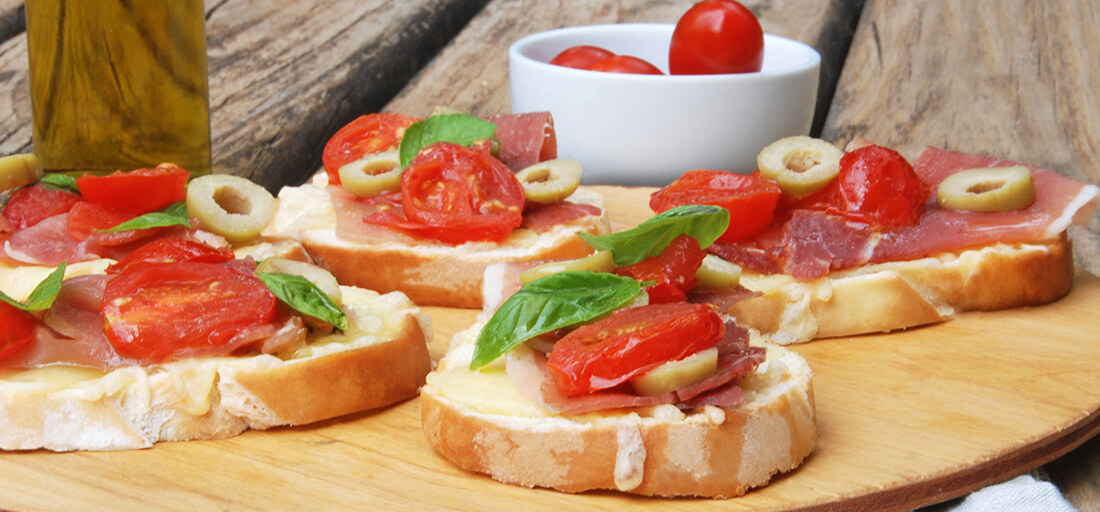 BRUSQUETTAS CON TOMATES, ACEITUNAS Y JAMÓN SERRANO