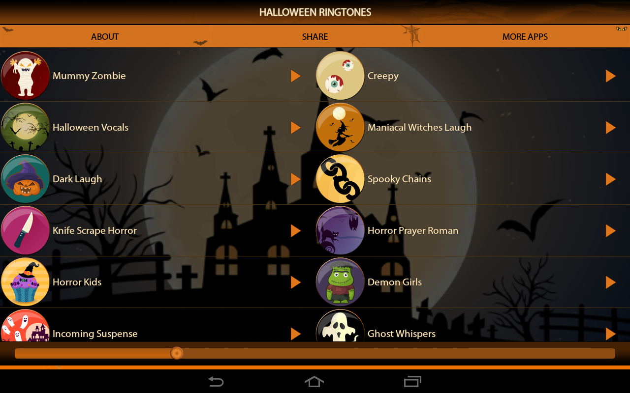 Scary Halloween Ringtones: Es una app gratuita que ofrece 45 tonos y sonidos para tu móvil absolutamente terroríficos. Desde vampiros que hablan, esqueletos o aullidos de lobos y zombies. El tono se puede asignar a todas las llamadas, las notificaciones, una alarma o cuando te llama alguien también que da miedo (como el jefe o la suegra, por ejemplo).