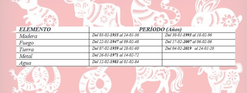 A las características propias del respectivo símbolo animal, y su polaridad, se le suma la de los cinco elementos de la naturaleza (Tierra, Metal, Agua, Madera y Fuego), que son modalidades en que se expresa la energía. Aunque cada doce años se repitan los mismos rasgos generales del respectivo animal, sólo se vuelve a repetir el mismo signo y elemento al completarse un Gran Ciclo de 60 años.