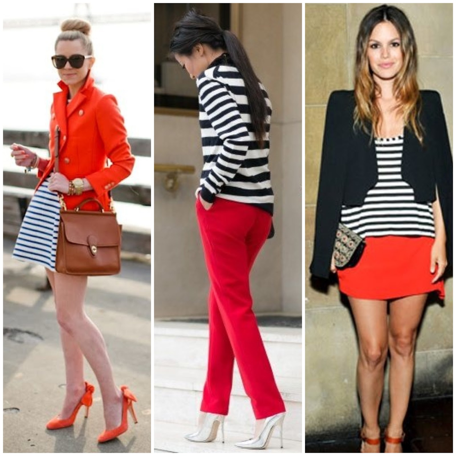 - La tendencia navy o marinera, por medio del clásico top a rayas o el blazer tailored, con los botones dorados a doble fila. Acá el juego va en dos puntos: en la parte de abajo, que va desde el pantalón formal al jeans pata de elefante, pasando por las faldas monocolor; el segundo foco de personalización es el color. Reemplaza la compañía de las dos prendas navy por el color que quieras, como pantalones rojos o una falda verde sin estampado.