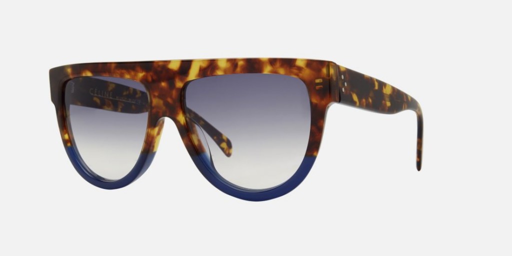 - Los maxi lentes setenteros con montura recta y cristales amplios bicolor, inspirados en Celine: los setentas están de vuelta y este es uno de los maxi lentes de sol favoritos de la época. La novedad, viene dada por un cristal en degradé y cuya marco tiene estampado y color. Este sí es ideal para las caras ovaladas y redondas.