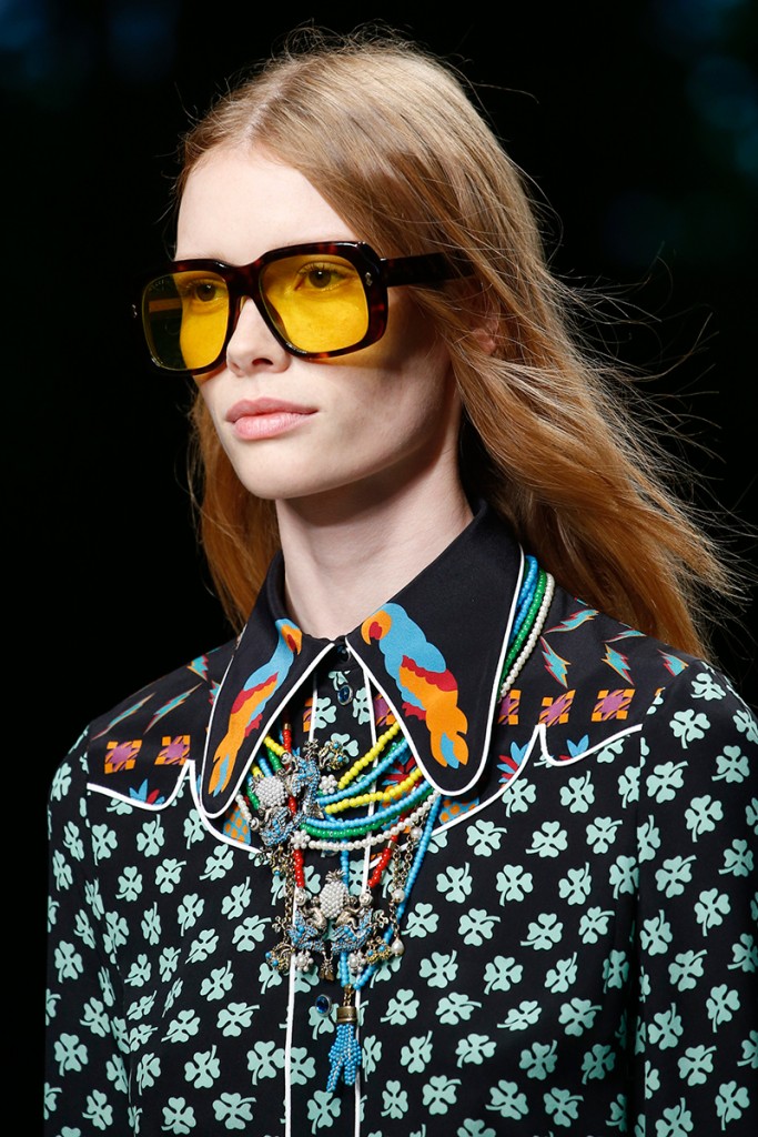 - La rareza de los cristales amarillos setenteros que nos recuerda lo mejor de la época hippie, también se vieron con fuerza en las pasarelas, como fue el caso de Gucci. Normalmente los lentes cuadrados oversize (tamaño grande) tienden a equilibrar los rostros ovalados y redondos. ¡El resto, es atreverse!