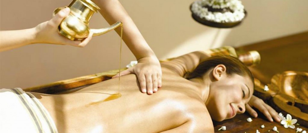 El primero que vemos es el masaje Shirodhara. Consiste en la aplicación de aceite medicinal tibio en la frente sobre el entrecejo (sexto chakra). El aceite se vierte de una manera suave y continua, algo que resulta muy relajante. Ayuda a tratar dolores crónicos de cabeza, insomnio, ansiedad y nerviosismo.