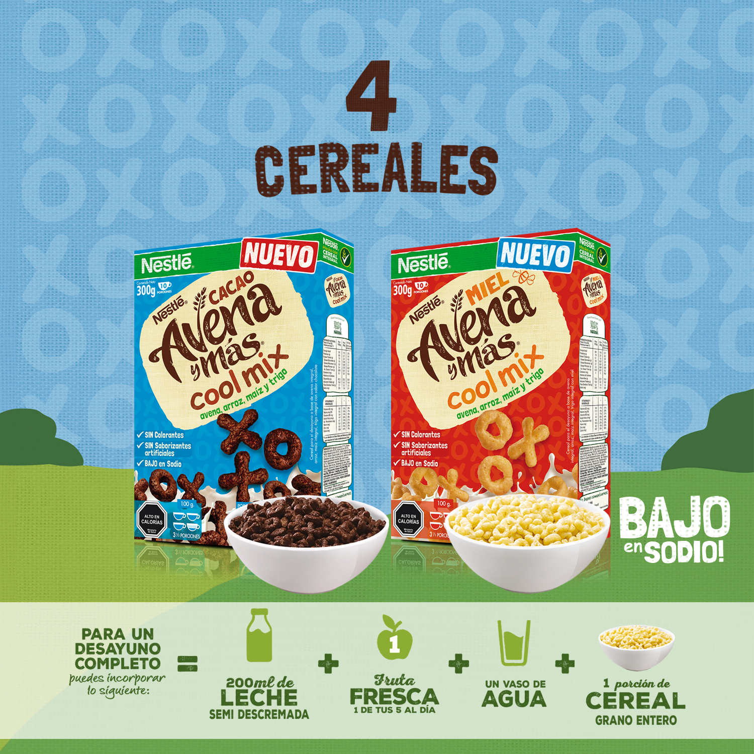 Avena y más cool mix es un cereal para el desayuno que está hecho con grano entero de Avena, Maíz y Trigo, además está enriquecido con vitaminas del complejo B, Hierro y Calcio al cual no se ha adicionado colorantes, saborizantes ni edulcorantes artificiales.