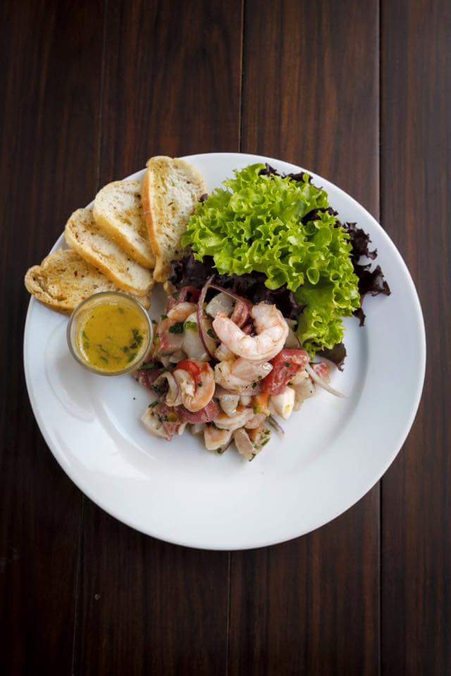 - Cortar los pescados y mariscos en cubitos. Luego, la cebolla en pluma, el cilantro muy fino y el pimentón en cuadraditos.