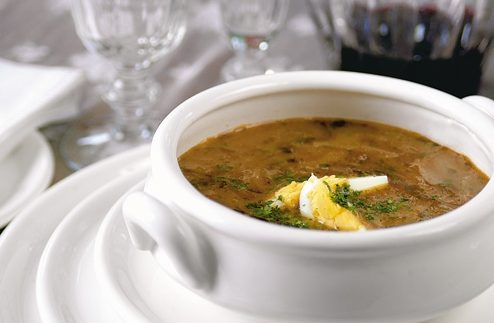 - Se mantiene todo al calor del fuego para que esté reposado y en el momento de servir se le agregan los 8 huevos escalfados. Estos últimos a preparan en una olla con agua caliente, casi en punto de ebullición. Luego poner un chorrito de vinagre. Hacer un remolino en el agua con una cuchara y romper la cascara del huevo para echarlo al medio del agua. Esperar que se cocine y sacar con espumadera