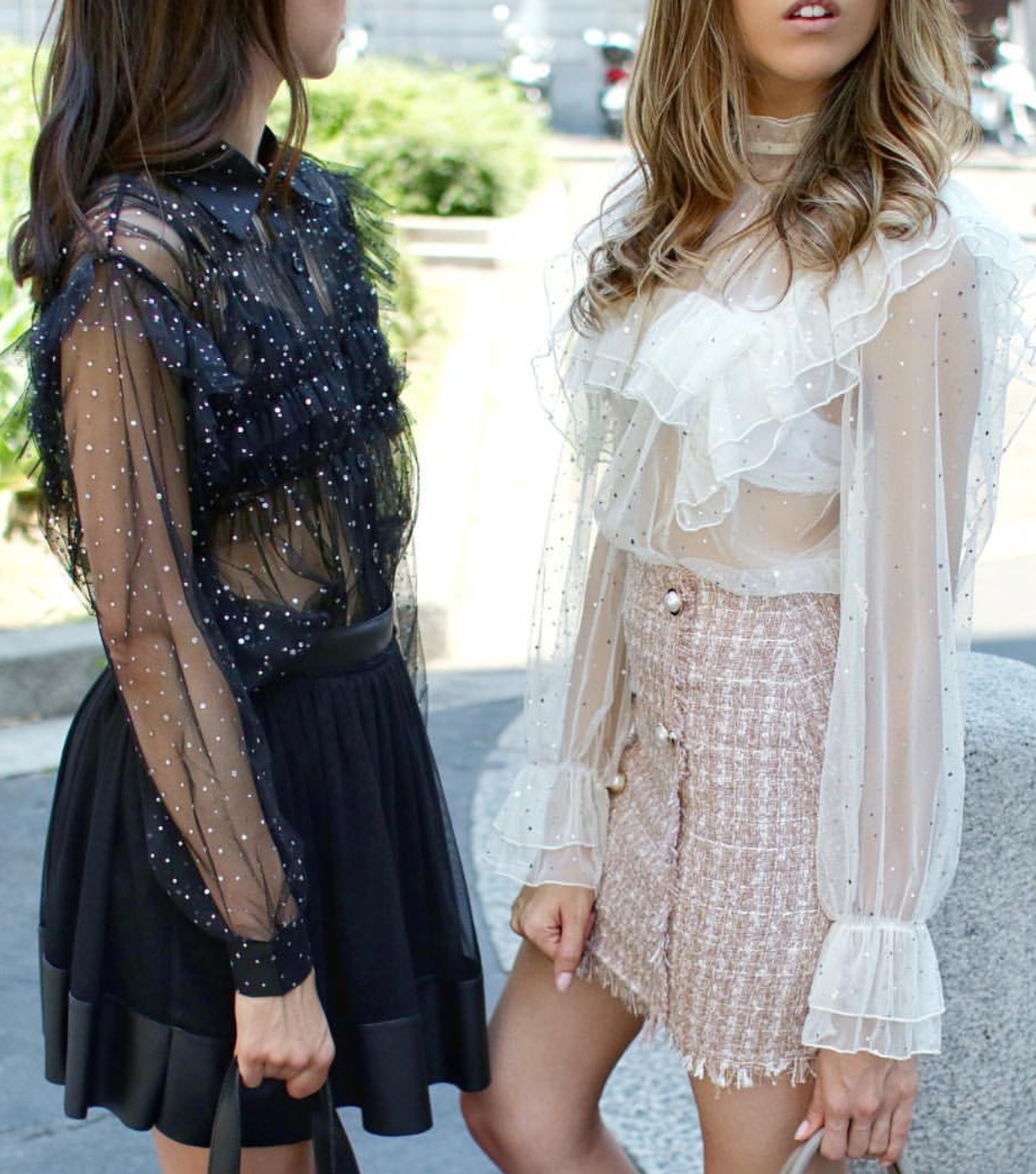 - Vamos a la prenda clave: la camisa transparente con vuelos. Normalmente en tonos neutros que dejan totalmente al descubierto el cuerpo, por ende, el sostén es la verdadera clave.