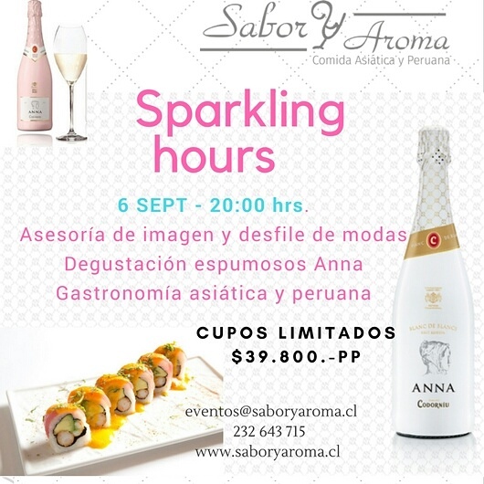 ¿Y qué más podrás disfrutar en este evento? La inolvidable velada será amenizada con los espumantes Premium de Anna de Cordoniu, que con su inconfundible elegancia y feminidad, aporta su toque de distinción y glamour al primer #SparklingHours en Sabor y Aroma. Maridados, por supuesto, con la mejor gastronomía asiática peruana de la capital. ¡Y habrá un DJ en vivo en la terraza con una vista increíble a la ciudad!