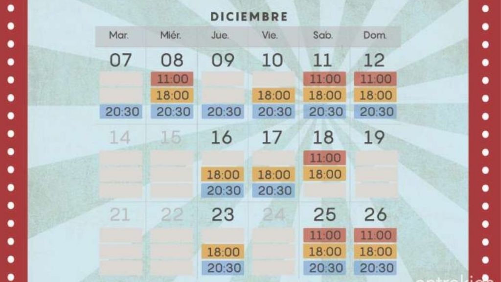 El Circo Navidad tiene funciones disponibles desde el 7 y hasta el 26 de diciembre. Y los horarios de las funciones, son a las 11:00, 18:00 y 20:30 horas.
