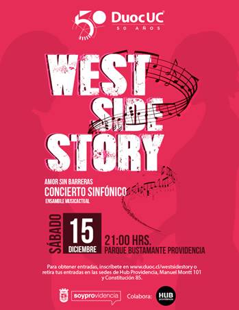 La producción a cargo de Duoc UC, está basada en la obra "Romeo y Julieta" de William Shakespeare, y se sitúa en la ciudad de Nueva York en los años 50. Aquí, bandas juveniles de distintos orígenes raciales (estadounidense v/s puertorriqueño) tienen una gran rivalidad y que se ve representado en el drama del amor imposible entre Tony y María, que están ligados de distintas formas a estas bandas enemigas.