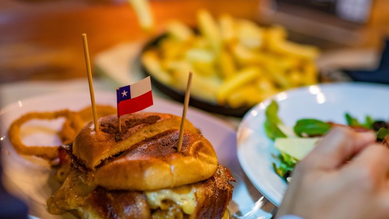 En una deliciosa caja de Bar Santiago, compuesta por sándwich de autor, chorillanas pitucas o veggie, coctelería y deliciosos churros, especialidad de la casa con la receta española.