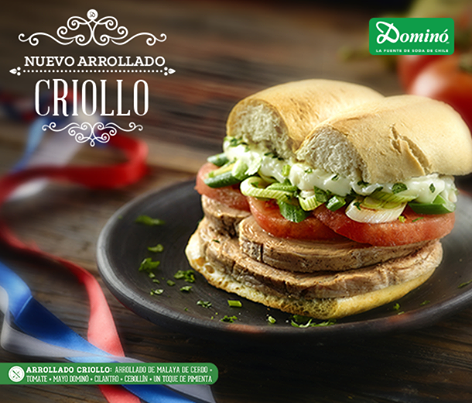 El famoso local "Dominó" decidió celebrar el mes de la patria con un increíble sándwich creado para esta ocasión. Se trata del nuevo "Arrollado Criollo" sabor 100% chileno y que está disponible en todos los locales Dominó durante el mes de septiembre, está preparado en pan de marraqueta con arroyado malaya de cerdo, tomate, mayo Dominó, cilantro, cebollín, más un toque de pimienta.