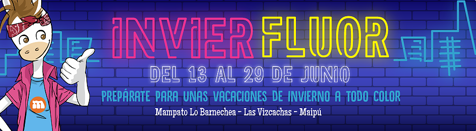 Se trata de "Invierfluor", donde personajes led, juegos completos vestidos con luces led, competencias de hip hop, y espectaculares murales pintados, llenarán de color las semanas de 13 al 29 de julio. Cada jornada además cerrará con una espectacular fiesta fluor para que toda la familia goce.