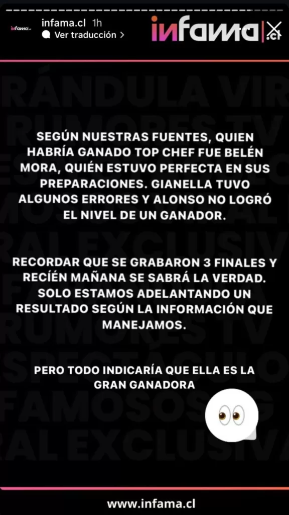 “Según nuestras fuentes, quien habría ganado Top Chef VIP fue Belén Mora, quien estuvo perfecta en sus preparaciones. Gianella tuvo algunos errores y Alonso no logró el nivel de un ganador”, expresó el sitio.