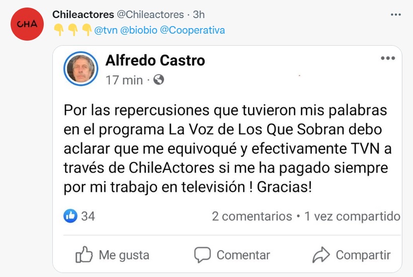 "Quiero aclarar, por las repercusiones que tuvieron mis palabras en el programa La Voz de los que Sobran, TVN siempre pagó a través de ChileActores mis trabajos en televisión! Gracias", declaró Alfredo Castro sin ahondar más en la situación.