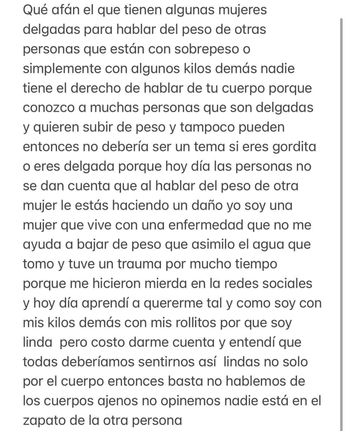 Luego confesó que "conozco a muchas personas que son delgadas y quieren subir de peso y tampoco pueden. Entonces no debería ser tema si eres gordita o eres delgada porque hoy día las personas de otra mujer le estás haciendo daño".