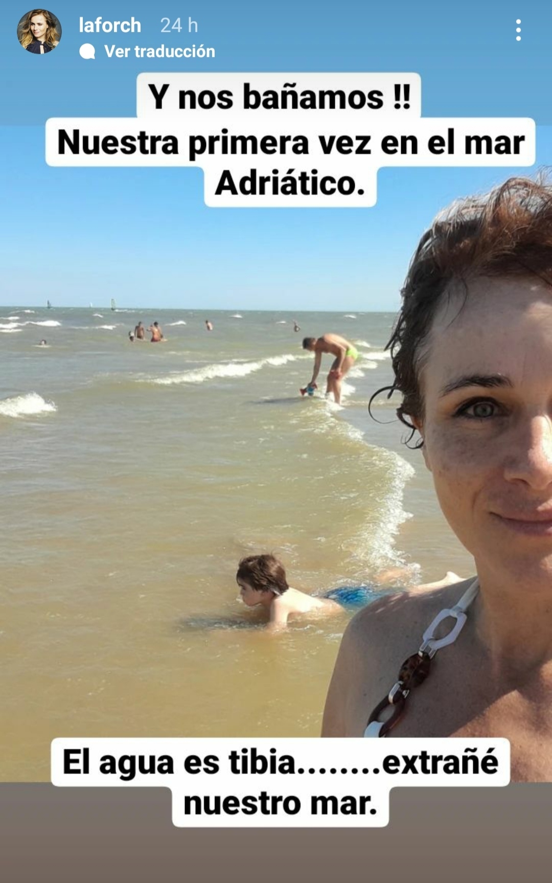 "Y nos bañamos!! Nuestra primera vez en el mar Adriático. El agua es tibia... extrañé nuestro mar", comentó en una historia que subió la actriz a su cuenta de Instagram.