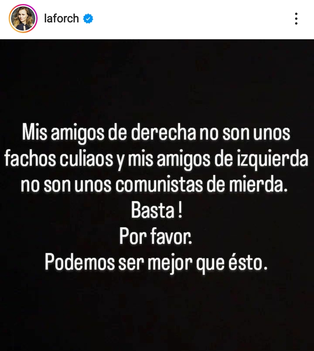 "Mis amigos de derecha no son unos fachos culi... y mis amigos de izquierda no son unos comunistas de mier... Basta! Por favor. Podemos ser mejor que esto", publicó la actriz y cantante de 50 años.