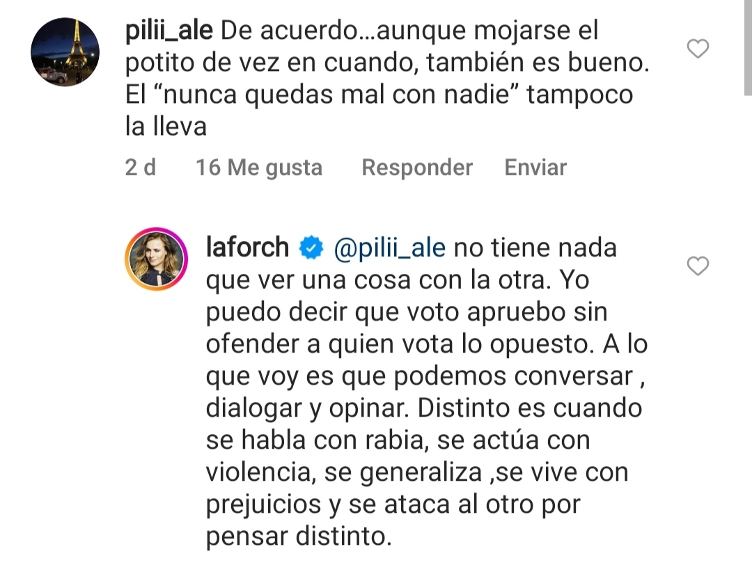 "No tiene nada que ver con una cosa con la otra. Yo puedo decir que apruebo sin ofender a quien vota lo opuesto", le contestó Amaya Forch.