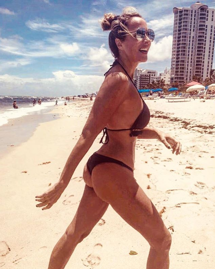 En la instantánea que compartió se le ve caminando por la playa, luciendo un bikini color café, que deja ver su tonificada figura.