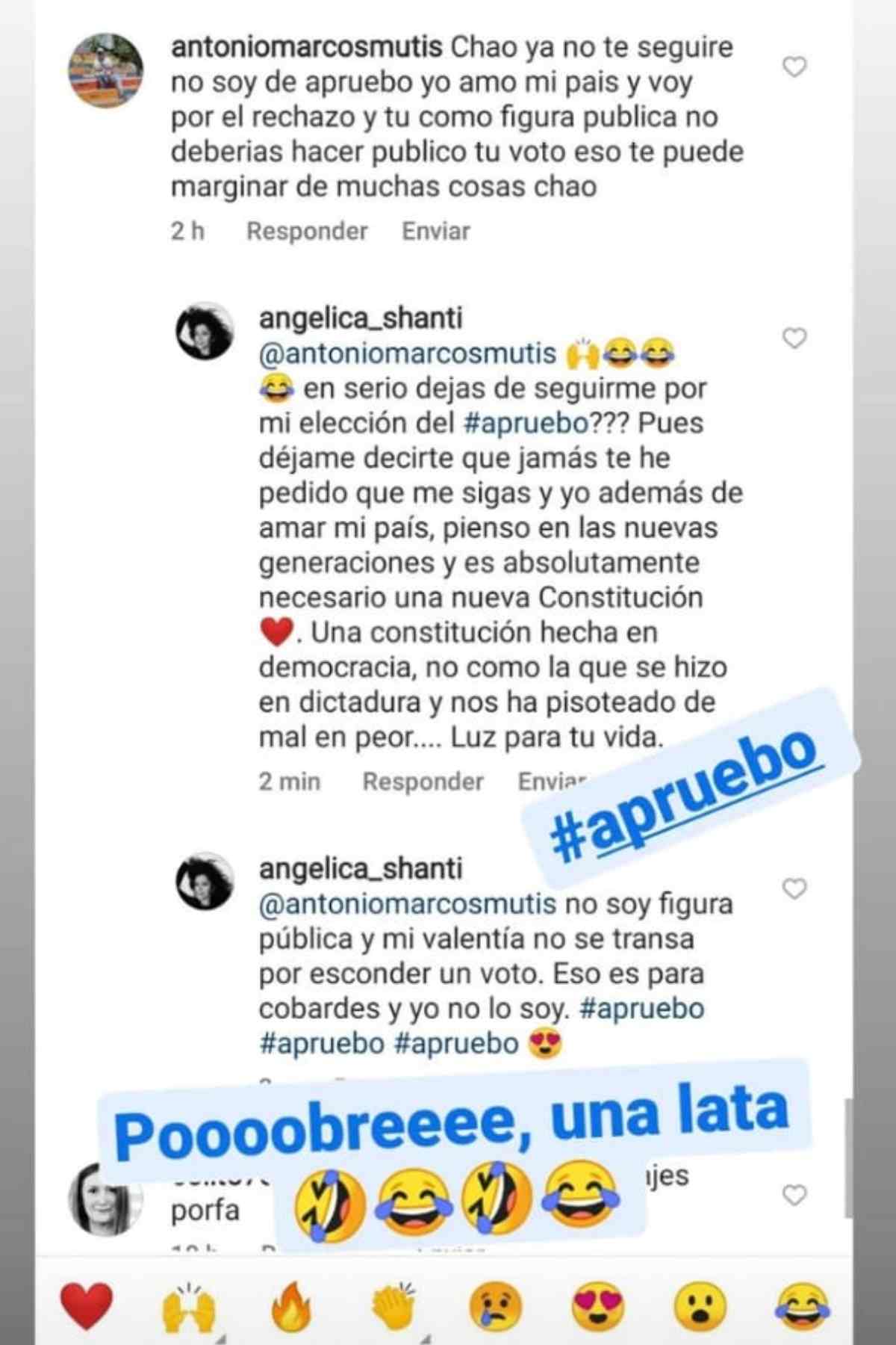 "Chao, no te seguiré. No soy de Apruebo, yo amo mi país y voy a ir por el Rechazo, y tú como figura pública no deberías hacer público tu voto. Eso te puede marginar de muchas cosas, chao", fue el mensaje que le dejó un señor llamado Antonio.