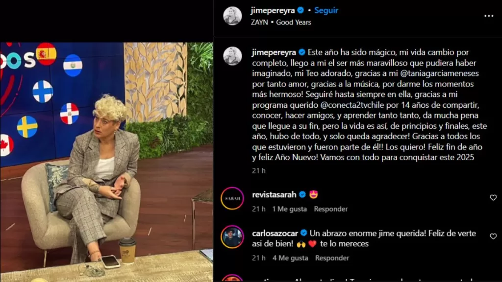 “Gracias a mi programa querido @conecta2tvchile por 14 años de compartir, conocer, hacer amigos, y aprender tanto, tanto, da mucha pena que llegue a su fin, pero la vida es así, de principios y finales, este año, hubo de todo, y solo queda agradecer”, señaló la argentina, recibiendo mensajes de apoyo.
