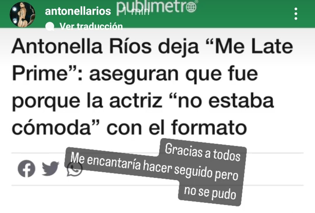 "Gracias a todos. Me encantaría haber seguido, pero no se pudo", declaró escuetamente Antonella Ríos a través de una historia en su cuenta de Instagram.