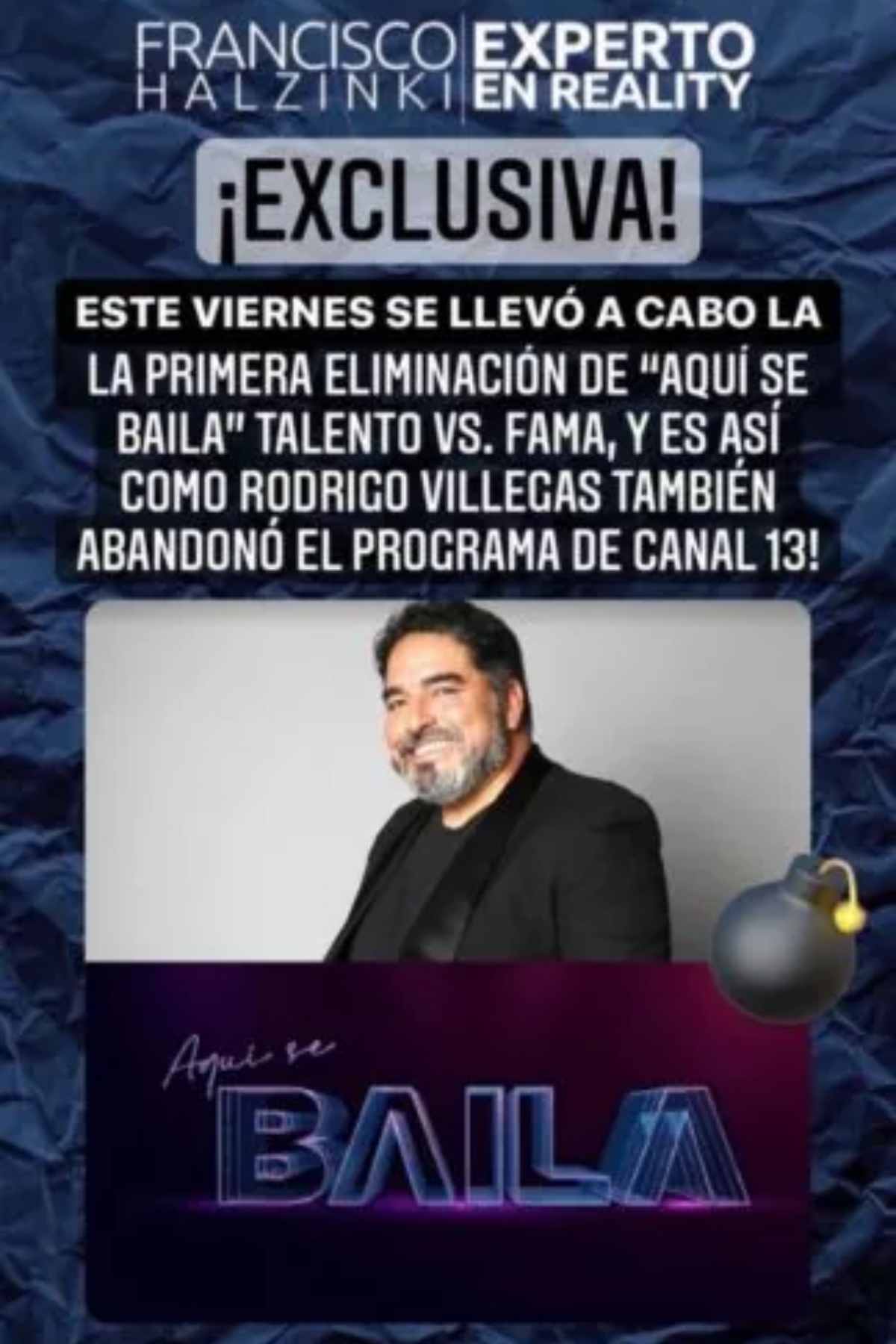 "Este viernes (01 de abril) se llevó a cabo la primera eliminación de Aquí se baila, talento vs. fama, y es así como Rodrigo Villegas también abandonó el programa de Canal 13", detalló.