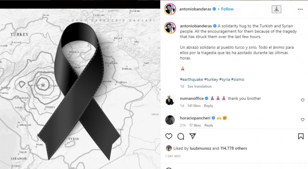 El actor español Antonio Banderas fue otro de los artistas que acudió a las redes ante la compleja situación que dejó el terremoto en Turquía y Siria. "Un abrazo solidario al pueblo turco y sirio. Todo el ánimo para ellos por la tragedia que les ha azotado durante las últimas horas", escribió en su Instagram: