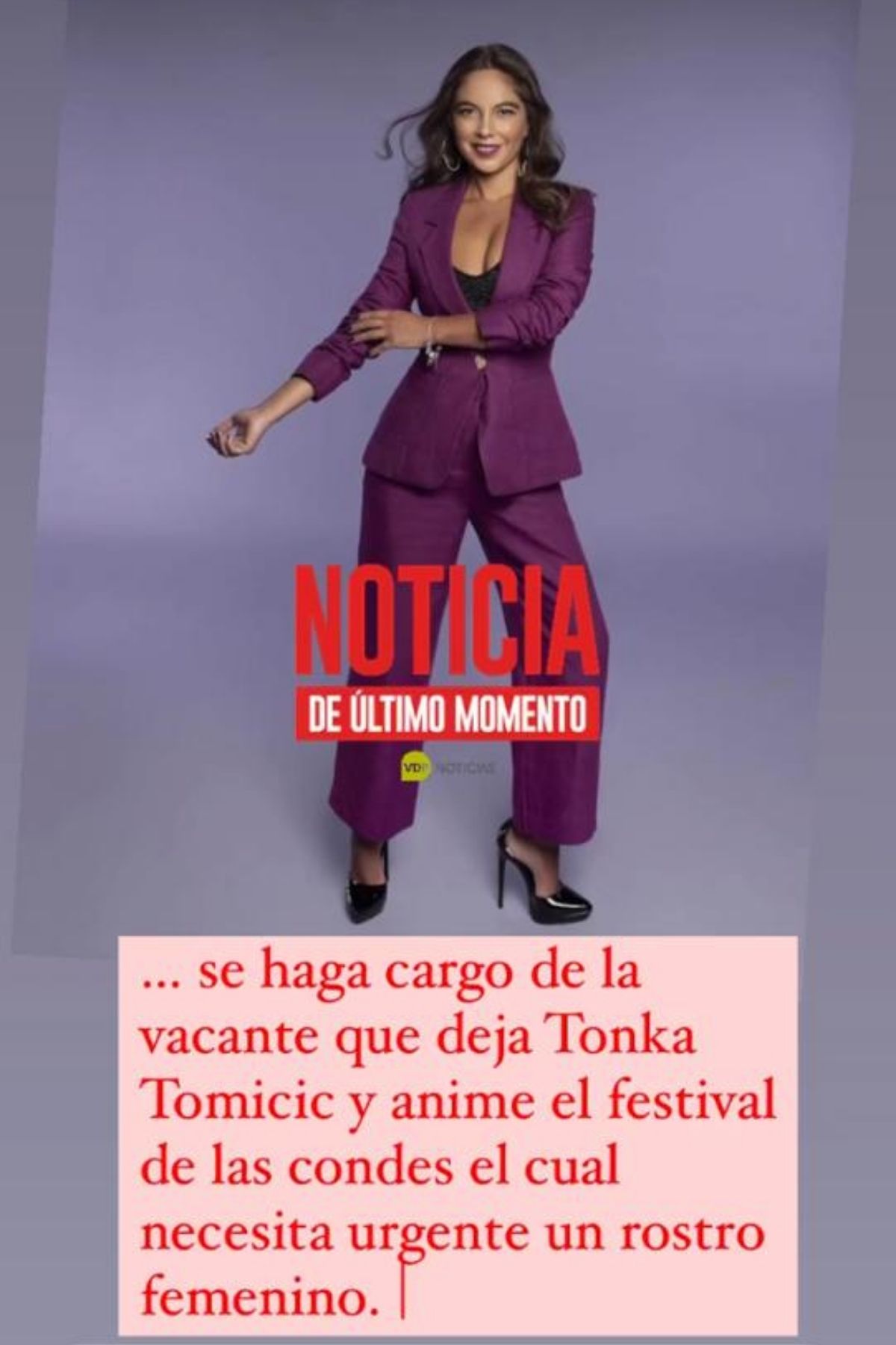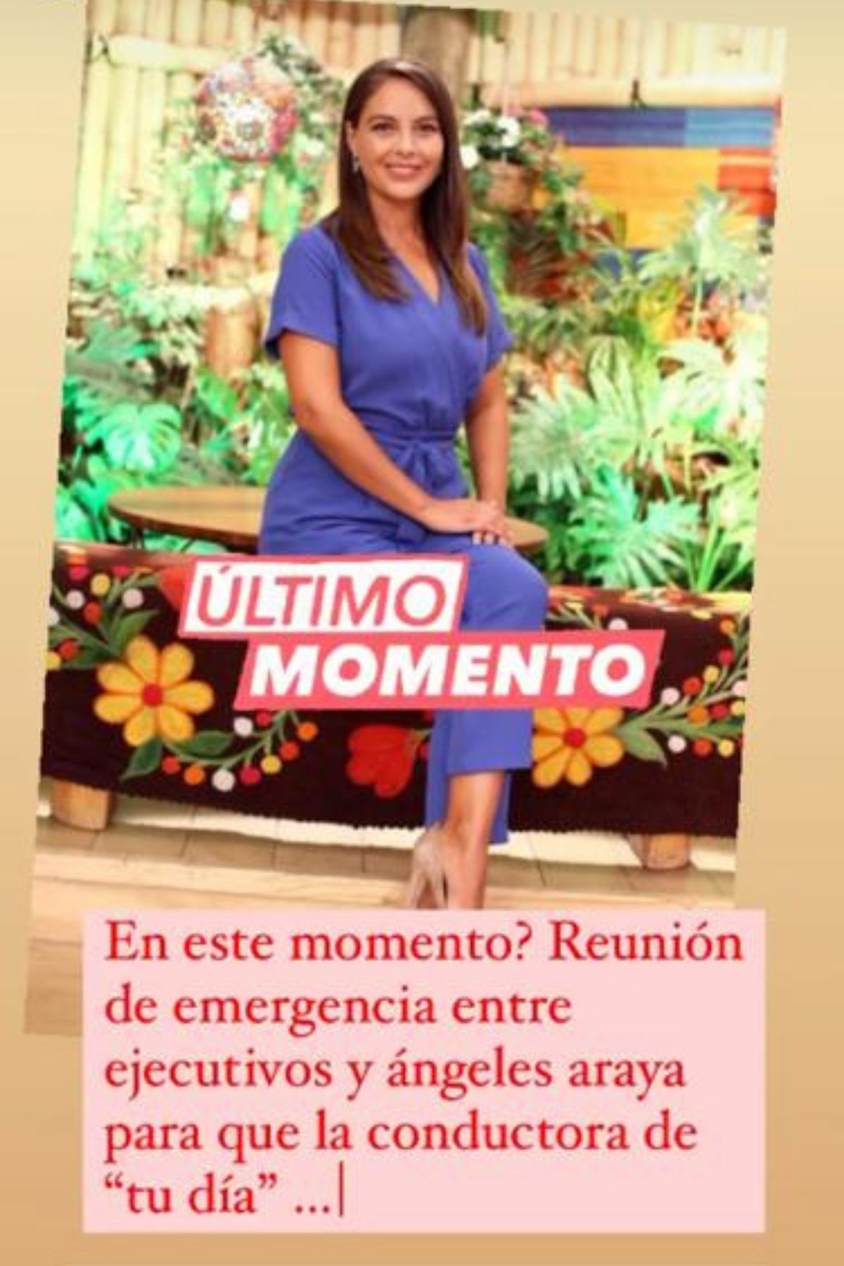 "Reunión de emergencia entre ejecutivos y Ángeles Araya para que la conductora de "Tu Día" se haga cargo de la vacante que deja Tonka Tomicic, y anime el Festival de Las Condes; el cuál necesita urgente un rostro femenino", consignó Paula Escobar en sus historias de Instagram.