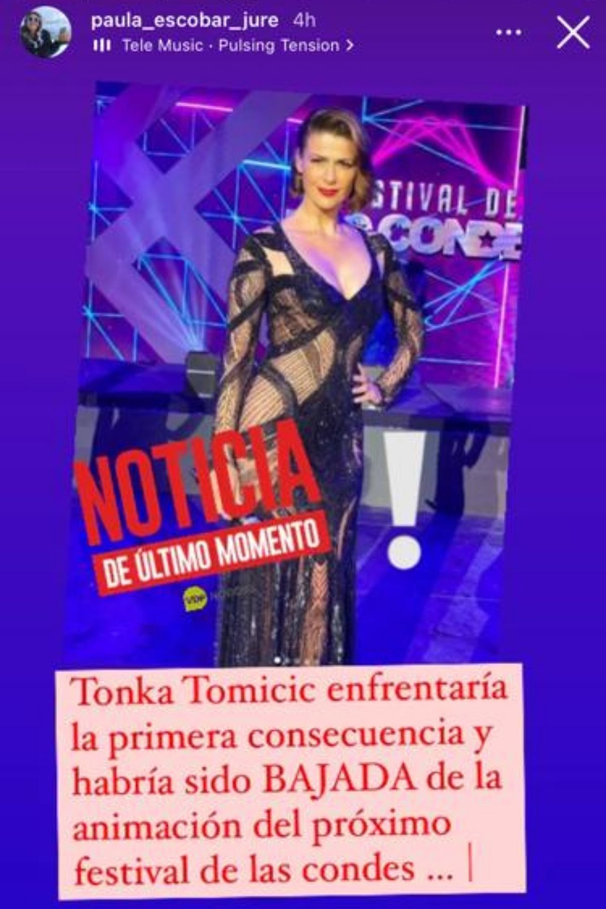 "A raíz de las informaciones, reportajes e involucrados en la investigación del caso joyas; en dónde el nombre de Parived aparece relacionado con los hechos; Tonka tomicic enfrentaría la primera consecuencia y habría sido bajada de la animación del próximo Festival de Las Condes", reveló la periodista en su cuenta de Instagram.