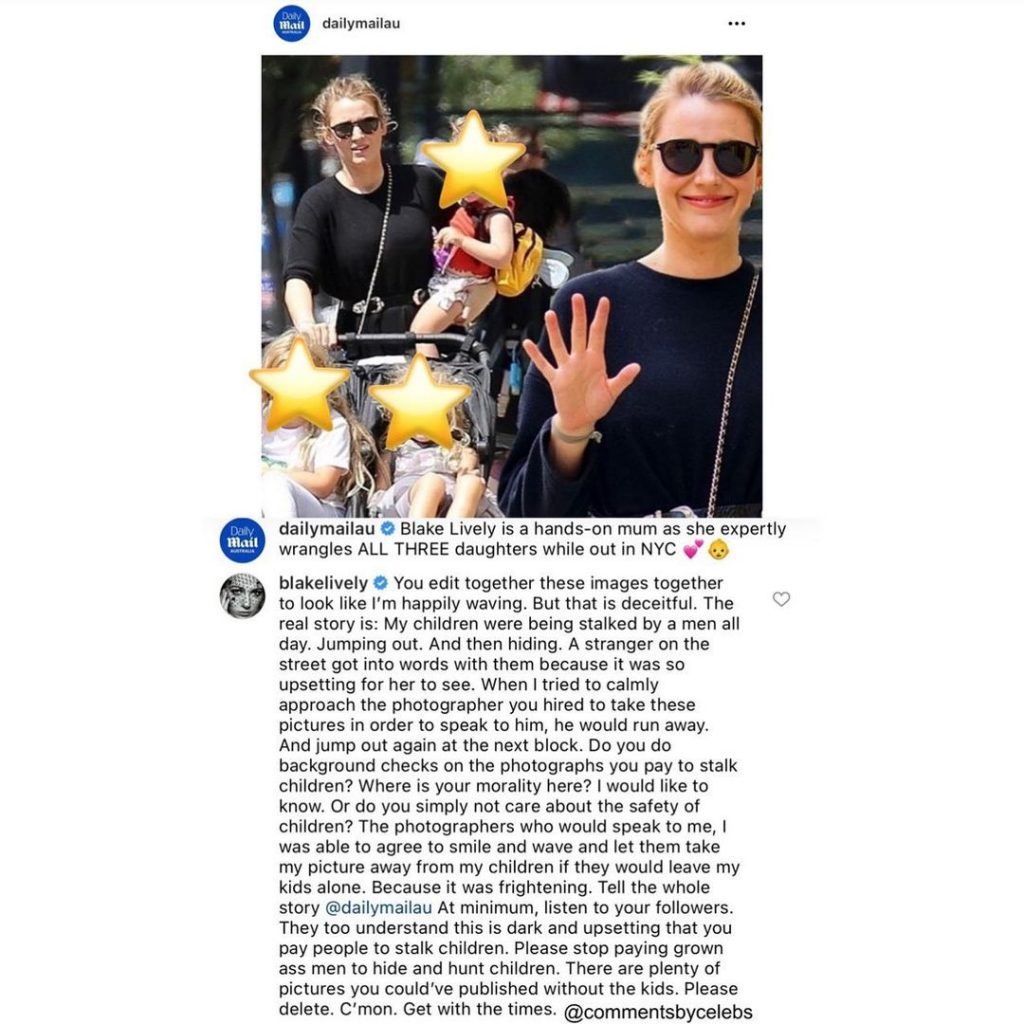 "¿Dónde está su moralidad aquí? Me gustaría saber. ¿O simplemente no les importa la seguridad de los niños?", escribió Blake Lively. Asimismo, la actriz cuestionó al diario por contratar a gente que no tiene un "mínimo de respeto" por perseguir a niños, a pesar de que sean hombres mayores.