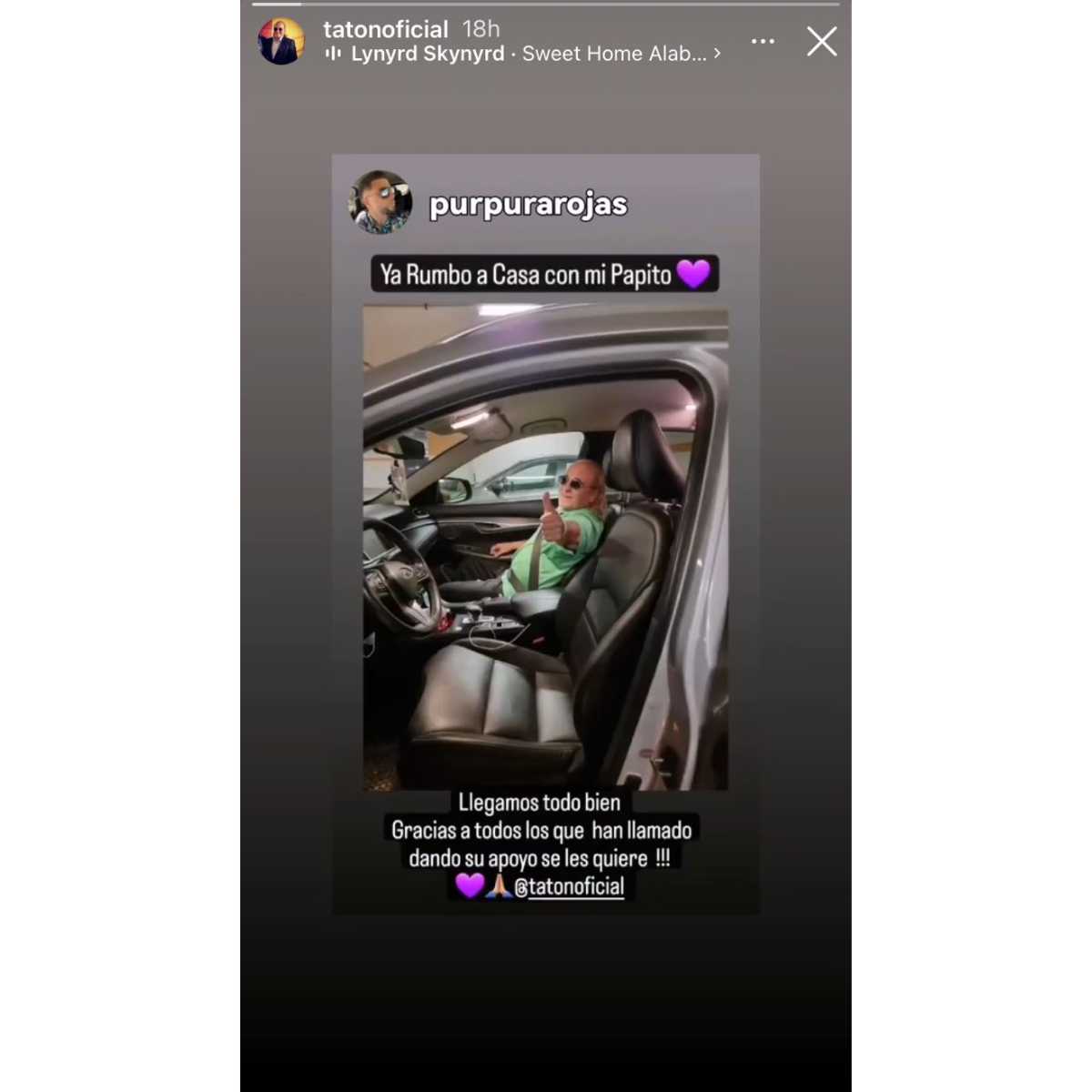 Y es que a través de sus redes sociales escribió: "Ya rumbo a casa con mi papito. Llegamos, todo bien. Gracias a todos los que han llamado dando su apoyo, se les quiere”, junto a una foto de Tatón en el asiento copiloto del auto.