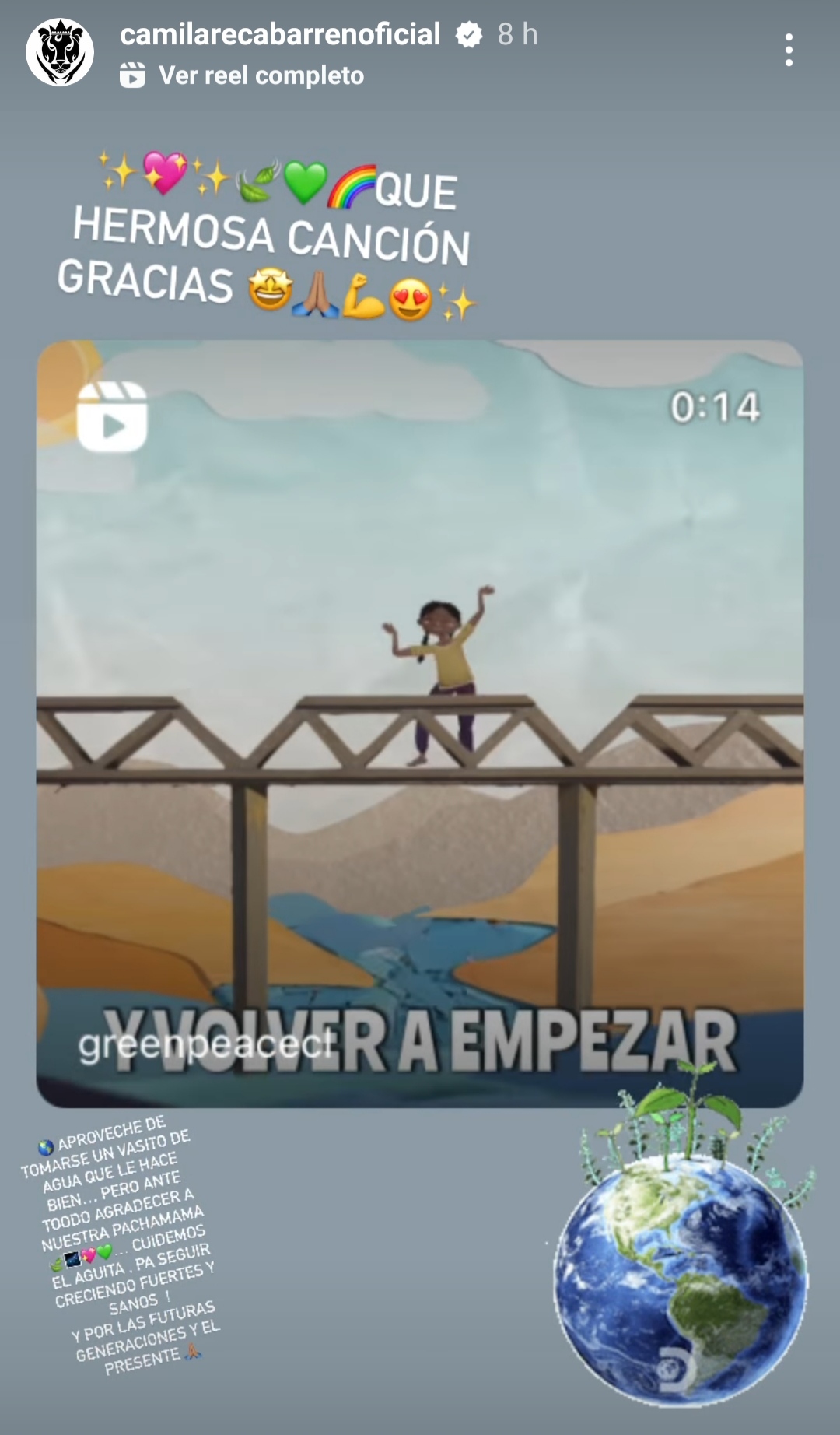"Aproveche de tomarse un vasito de agua que le hace bien. Pero ante todo agradecer a nuestra pachamama... Cuidemos el aguita pa seguir creciendo fuertes y sanos! Y por las futuras generaciones y el presente", escribió Camila Recabarren a través de otra historia que subió a su red social.