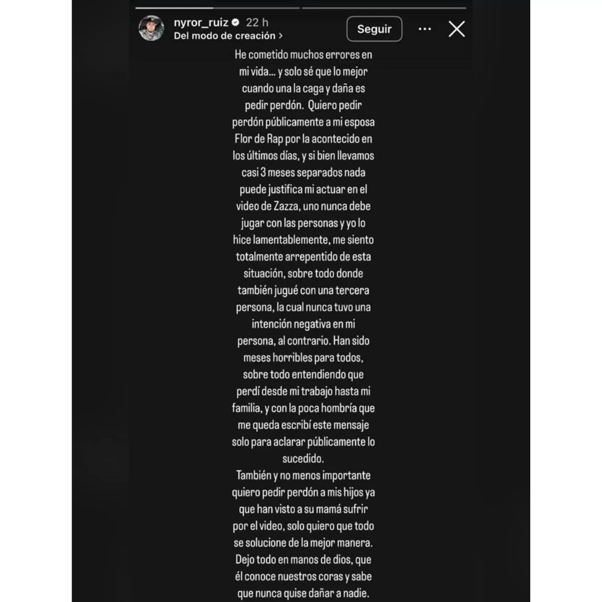 De todas maneras, Flor de Rap pidió consideración con Nyor Ruiz: "Les pido que no lo ataquen y no caigan en el ciberbullying ya que nadie está libre de cometer errores en esta vida".