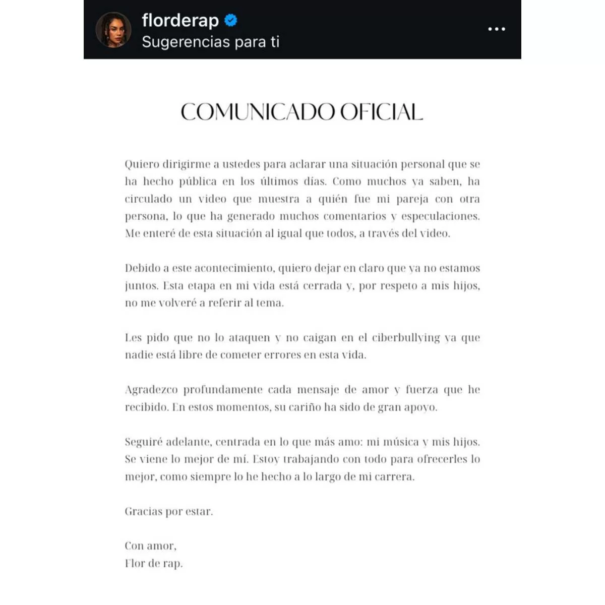 "Quiero dirigirme a ustedes para aclarar una situación personal que se ha hecho pública en los últimos días. Como muchos ya saben, ha circulado un video que muestra a quién fue mi pareja con otra persona, lo que ha generado muchos comentarios y especulaciones", partió diciendo Flor de Rap.