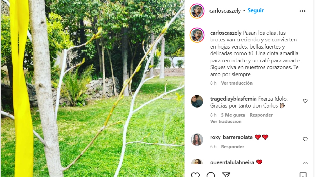 "Pasan los días, tus brotes van creciendo y se convierten en hojas verdes, bellas, fuertes y delicadas como tú. Una cinta amarilla para recordarte y un café para amarte. Sigues viva en nuestros corazones. Te amo por siempre", escribió Carlos Caszely.