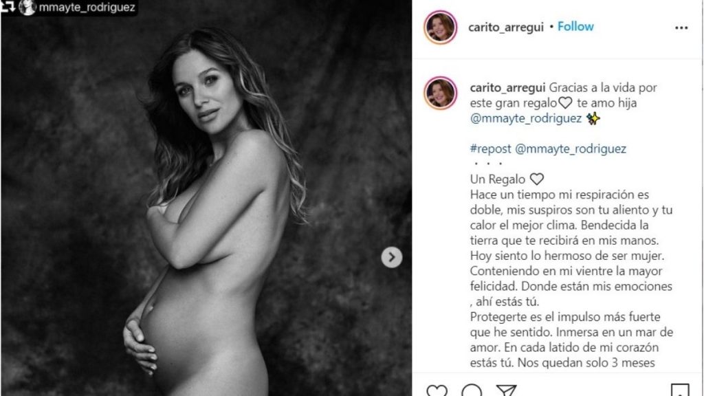 Finalmente, más tarde volvió a postear la publicación de su hija e insistió en mostrar su enorme felicidad por la llega del bebé, su nieto o nieta: «Gracias a la vida por este gran regalo. Te amo hija», finalizó Carolina Arregui tras conocerse la noticia del embarazo de su hija Mayte Rodríguez.