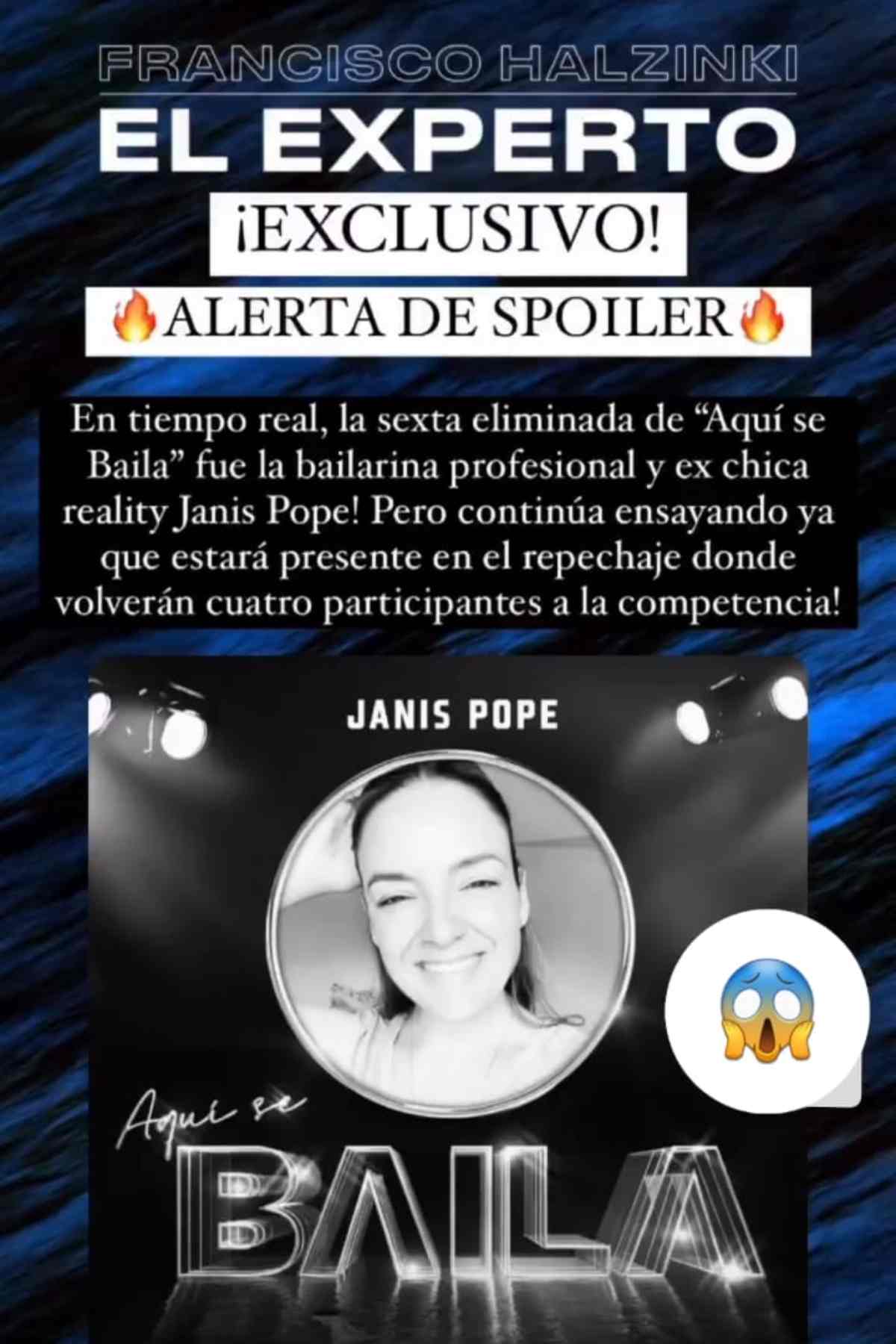"En tiempo real, la sexta eliminada de Aquí se Baila fue la bailarina profesional y ex chica reality Janis Pope! Pero continúa ensayando ya que estará presente en el repechaje donde volverán cuatro participantes a la competencia!", detalló.