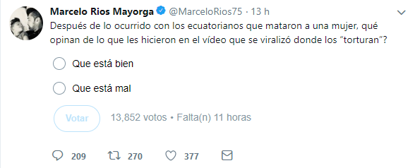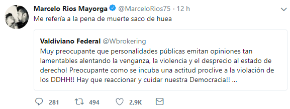 Y en twitter, el ex tenista, Marcelo "Chino" Ríos también quiso expresar su opinión respecto al video, y pidió que no "victimizaran" a los imputados ecuatorianos.