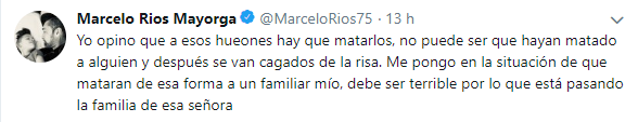 "Yo opino que a esos hueones hay que matarlos. No puede ser que hayan matado a alguien y después se van cagados de la risa. Me pongo en la situación de que mataran de esa forma a un familiar mío, deber ser terrible por lo que está pasando la familia de esa señora", escribió en Twitter.