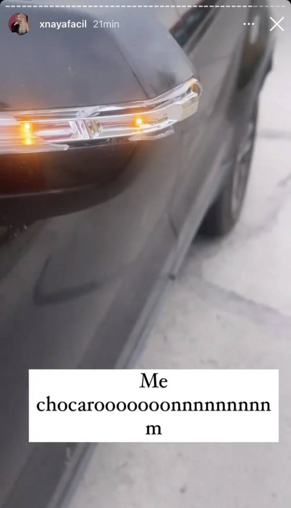 "Conchetu... me acaban de chocar el espejo (...) Venía para acá y el feo culi.. No sé. Me cargan que anden apurados", inició Naya en su reclamo por medio de la misma red social.