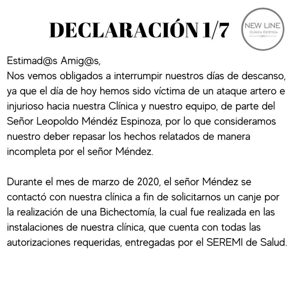 "Hay otros antecedentes de la ficha clínica del señor (Leo) Méndez que nos permiten asegurar que no se cumplió con los cuidados post operatorios. No obstante, nuestro equipo médico estuvo siempre acompañándolo hasta la remisión de los efectos secundarios del procedimiento", añadieron.